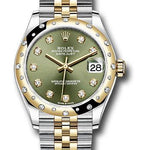 31mm yellow Rolesor case comprised of Oystersteel and 18K yellow gold, screw-down back, screw-down crown with twinlock double waterproofness system, 18K yellow gold domed bezel set with diamonds, scratch-resistant sapphire crystal with cyclops lens over the date, olive green dial, diamond hour markers, Rolex calibre 2236 perpetual self-winding movement with date at 3 o'clock, approximately 55 hours of power reserve, yellow Rolesor Jubilee bracelet with semi-circular three-piece links, concealed folding Crownclasp buckle. Waterproof to 100 meters. Baselworld 2019 release.