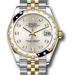 31mm yellow Rolesor case comprised of Oystersteel and 18K yellow gold, screw-down back, screw-down crown with twinlock double waterproofness system, 18K yellow gold domed bezel set with diamonds, scratch-resistant sapphire crystal with cyclops lens over the date, silver dial, diamond hour markers, Rolex calibre 2236 perpetual self-winding movement with date at 3 o'clock, approximately 55 hours of power reserve, yellow Rolesor Jubilee bracelet with semi-circular three-piece links, concealed folding Crownclasp buckle. Waterproof to 100 meters. Baselworld 2019 release.