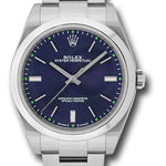 39mm stainless steel case, screw-down back, screw-down crown with twinlock double waterproofness system, domed bezel, scratch-resistant sapphire crystal, blue dial, index hour markers, Rolex calibre 3132 automatic movement with center hour, minute and seconds hands, stop-seconds for precise time setting, stainless steel Oyster bracelet with flat three-piece links, folding Oysterclasp buckle. Waterproof to 100 meters.