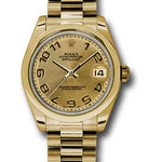 31mm 18K yellow gold case, domed bezel, champagne concentric circle dial, Arabic numerals, and President bracelet.