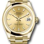 31mm 18K yellow gold case, screw-down crown with twinlock double waterproofness system, domed bezel, scratch-resistant sapphire crystal with cyclops lens over the date, champagne dial, index hour markers, Rolex calibre 2236 automatic movement with center hour, minute and seconds hands, instantaneous date with rapid setting, and stop-seconds for precise time setting, approximately 55 hours of power reserve, 18K yellow gold President bracelet with semi-circular three-piece links, concealed folding Crownclasp buckle. Waterproof to 100 meters.