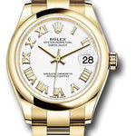 31mm 18K yellow gold case, screw-down crown with twinlock double waterproofness system, domed bezel, scratch-resistant sapphire crystal with cyclops lens over the date, white dial, Roman numerals, Rolex calibre 2236 automatic movement with center hour, minute and seconds hands, instantaneous date with rapid setting, and stop-seconds for precise time setting, approximately 55 hours of power reserve, 18K yellow gold Oyster bracelet with flat three-piece links, concealed folding Crownclasp buckle. Waterproof to 100 meters.
