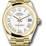 31mm 18K yellow gold case, screw-down crown with twinlock double waterproofness system, domed bezel, scratch-resistant sapphire crystal with cyclops lens over the date, white dial, Roman numerals, Rolex calibre 2236 automatic movement with center hour, minute and seconds hands, instantaneous date with rapid setting, and stop-seconds for precise time setting, approximately 55 hours of power reserve, 18K yellow gold President bracelet with semi-circular three-piece links, concealed folding Crownclasp buckle. Waterproof to 100 meters.