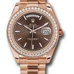 40mm 18K Everose gold case, screw-down back with Rolex fluting, screw-down crown with twinlock double waterproofness system, Everose gold bezel set with 48 diamonds, scratch-resistant double anti-reflective sapphire crystal with cyclops lens over the date, chocolate diagonal motif dial, index hour markers with Chromalight, Rolex calibre 3255 automatic movement with centre hour, minute and seconds hands, instantaneous day and date in apertures, unrestricted rapid-setting, and stop-seconds for precise time setting, approximately 70 hours of power reserve, President bracelet with three-piece solid links comprised of a polished center link, satin-finished outer links, and ceramic inserts, concealed folding Crownclasp buckle. Waterproof to 100 meters.