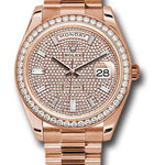 40mm 18K Everose gold case, screw-down back with Rolex fluting, screw-down crown with twinlock double waterproofness system, Everose gold bezel set with 48 diamonds, scratch-resistant double anti-reflective sapphire crystal with cyclops lens over the date, diamond paved dial, 10 baguette-cut diamond hour markers, Rolex calibre 3255 automatic movement with centre hour, minute and seconds hands, instantaneous day and date in apertures, unrestricted rapid-setting, and stop-seconds for precise time setting, approximately 70 hours of power reserve, President bracelet with three-piece solid links comprised of a polished center link, satin-finished outer links, and ceramic inserts, concealed folding Crownclasp buckle. Waterproof to 100 meters.