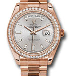 40mm 18K Everose gold case, screw-down back with Rolex fluting, screw-down crown with twinlock double waterproofness system, Everose gold bezel set with 48 diamonds, scratch-resistant double anti-reflective sapphire crystal with cyclops lens over the date, sundust dial, 10 baguette-cut diamond hour markers, Rolex calibre 3255 automatic movement with centre hour, minute and seconds hands, instantaneous day and date in apertures, unrestricted rapid-setting, and stop-seconds for precise time setting, approximately 70 hours of power reserve, President bracelet with three-piece solid links comprised of a polished center link, satin-finished outer links, and ceramic inserts, concealed folding Crownclasp buckle. Waterproof to 100 meters.
