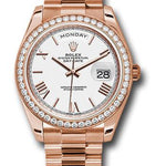 40mm 18K Everose gold case, screw-down back with Rolex fluting, screw-down crown with twinlock double waterproofness system, Everose gold bezel set with 48 diamonds, scratch-resistant double anti-reflective sapphire crystal with cyclops lens over the date, white dial, bevelled deconstructed Roman numerals, Rolex calibre 3255 automatic movement with centre hour, minute and seconds hands, instantaneous day and date in apertures, unrestricted rapid-setting, and stop-seconds for precise time setting, approximately 70 hours of power reserve, President bracelet with three-piece solid links comprised of a polished center link, satin-finished outer links, and ceramic inserts, concealed folding Crownclasp buckle. Waterproof to 100 meters.