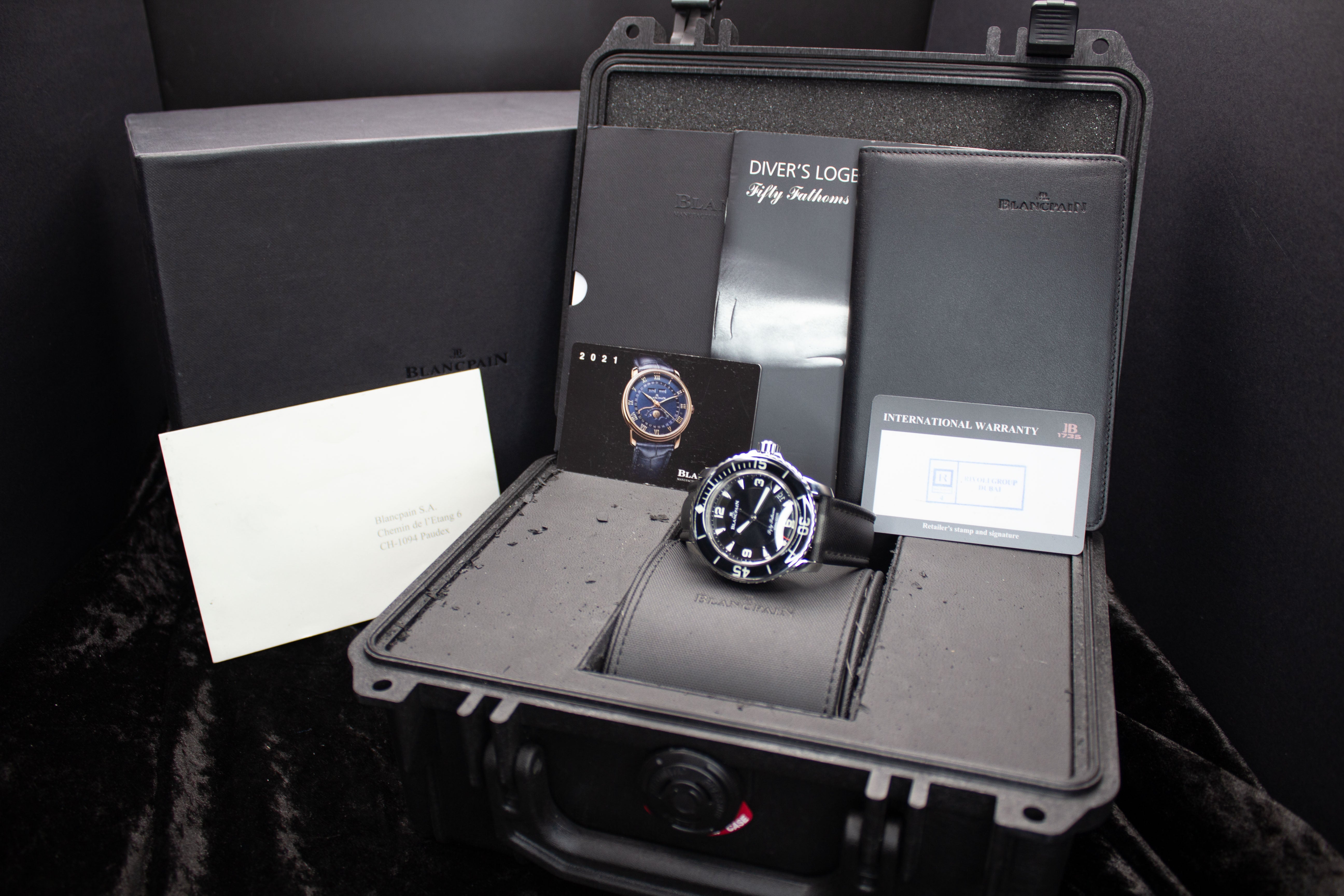 Up for sale is the Blancpain Fifty Fathoms Automatique 5015 1130 52A 45MM Steel Black Dial with Warranty card, diver's logbook, Service booklet, Booklet, privacy notice, and is double boxed. Watch is dated 2021. Watch warranty is good through 2026. MSRP $19,100. It was recently placed on a timegrapher and is running well. All of our watches are photographed under high intensity light with a macro lens. Any flaws will be significantly magnified. The serial numbers have been blurred for privacy. Timepiece is in excellent condition showing little to no signs of wear. Timepiece is located in Indiana.