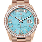 Indulge in the timeless elegance of the Rolex Day-Date 36 Turquoise Dial Diamond Bezel 18K Everose Gold President Watch, a true icon of luxury and refinement.