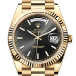 The Rolex Day-Date 40 Bright Black Dial Index 18K Yellow Gold President Men's Watch sets the standard for sophistication and remains an emblem of status, reflecting the wearer's appreciation for the finest in watchmaking craftsmanship and enduring style.