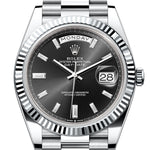 The Rolex Day-Date 40 Bright Black Dial with 10 Baguette-Cut Diamonds, set within a Fluted Bezel Platinum President Men's Watch, embodies sophistication, artistry, and an unwavering dedication to excellence in watchmaking.