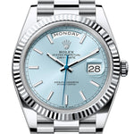 Immerse yourself in the timeless elegance of the Rolex Day-Date 40, a pinnacle of sophistication and prestige, featuring an ethereal Ice-Blue Dial encased in platinum.