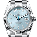 Indulge in the sheer opulence of the Rolex Day-Date 40, an emblem of sophistication and prestige, showcasing an ethereal Ice-Blue Dial adorned with exquisite Baguette-cut Diamonds.