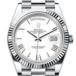 Adorned with the esteemed Swiss Made label, the Rolex Day-Date 40 in Platinum with a White Dial and Fluted Bezel stands as a timeless symbol of refinement, craftsmanship, and enduring sophistication.