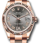 31mm 18K Everose gold case, screw-down crown with twinlock double waterproofness system, fluted bezel, scratch-resistant sapphire crystal with cyclops lens over the date, dark rhodium diamond Roman IV dial, Roman numerals with 11 diamonds set on VI, Rolex calibre 2236 automatic movement with center hour, minute and seconds hands, instantaneous date with rapid setting, and stop-seconds for precise time setting, approximately 55 hours of power reserve, 18K Everose gold Oyster bracelet with flat three-piece links, concealed folding Crownclasp buckle. Waterproof to 100 meters.