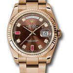 36mm 18K Everose gold case, fluted bezel, chocolate dial, 8 diamond and 2 baguette ruby hour markers, and Oyster bracelet.
