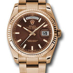 36mm 18K Everose gold case, screw-down back, screw-down crown with twinlock double waterproofness system, fluted bezel, scratch-resistant sapphire crystal with cyclops lens over the date and double anti-reflective coating, chocolate dial, index hour markers, Rolex calibre 3155 automatic movement with rapid setting date and day, 18K Everose gold Oyster bracelet with flat three-piece links, concealed folding Crownclasp buckle. Waterproof to 100 meters.