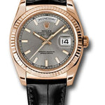 36mm 18K Everose gold case, fluted bezel, rhodium dial, index hour markers, calibre 3155 self-winding chronometer movement with day and date display, black leather strap with gold deployable clasp. Waterproof to 100 meters.