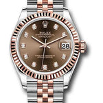 31mm Everose Rolesor case comprised of Oystersteel and 18K Everose gold, screw-down back, screw-down crown with twinlock double waterproofness system, 18K Everose gold fluted bezel, scratch-resistant sapphire crystal with cyclops lens over the date, chocolate dial, diamond hour markers, Rolex calibre 2236 perpetual self-winding movement with date at 3 o'clock, approximately 55 hours of power reserve, Everose Rolesor Jubilee bracelet with semi-circular three-piece links, concealed folding Crownclasp buckle. Waterproof to 100 meters. Baselworld 2019 release.