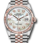 36mm Everose Rolesor case with Oystersteel monobloc middle case, screw-down steel back, screw-down 18K Everose crown, 18K Everose fluted bezel, white mother-of-pearl dial, 10 diamond hour markers, Rolex calibre 3235 self-winding movement with date at 3 o'clock, approximately 70 hours of power reserve, Everose Rolesor Jubilee bracelet with five-piece links, folding Oysterclasp buckle with Easylink 5mm comfort extension link. Waterproof to 100 meters. Redesigned for Baselworld 2018 with updated case sides, lugs, and calibre 3235 movement.