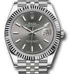 41mm white Rolesor case comprised of a 904L steel monobloc middle case, screw-down steel back, screw-down crown with twinlock double waterproofness system, 18K white gold fluted bezel, scratch-resistant double anti-reflective sapphire crystal with cyclops lens over the date, dark rhodium dial, index hour markers, Rolex calibre 3235 perpetual self-winding movement with date at 3 o'clock that changes instantaneously at midnight in a few thousandths of a second, approximately 70 hours of power reserve, 904L steel Jubilee bracelet with five-piece links, folding Oysterclasp buckle with Easylink 5mm comfort extension link. Waterproof to 100 meters.