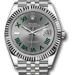 41mm white Rolesor case comprised of a 904L steel monobloc middle case, screw-down steel back, screw-down crown with twinlock double waterproofness system, 18K white gold fluted bezel, scratch-resistant double anti-reflective sapphire crystal with cyclops lens over the date, slate dial, green Roman numerals, Rolex calibre 3235 perpetual self-winding movement with date at 3 o'clock that changes instantaneously at midnight in a few thousandths of a second, approximately 70 hours of power reserve, 904L steel Jubilee bracelet with five-piece links, folding Oysterclasp buckle with Easylink 5mm comfort extension link. Waterproof to 100 meters.
