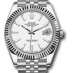 41mm white Rolesor case comprised of a 904L steel monobloc middle case, screw-down steel back, screw-down crown with twinlock double waterproofness system, 18K white gold fluted bezel, scratch-resistant double anti-reflective sapphire crystal with cyclops lens over the date, white dial, index hour markers, Rolex calibre 3235 perpetual self-winding movement with date at 3 o'clock that changes instantaneously at midnight in a few thousandths of a second, approximately 70 hours of power reserve, 904L steel Jubilee bracelet with five-piece links, folding Oysterclasp buckle with Easylink 5mm comfort extension link. Waterproof to 100 meters.