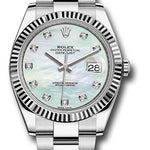 41mm white Rolesor case comprised of a 904L steel monobloc middle case, screw-down steel back, screw-down crown with twinlock double waterproofness system, 18K white gold fluted bezel, scratch-resistant double anti-reflective sapphire crystal with cyclops lens over the date, white mother-of-pearl dial, 10 diamond hour markers, Rolex calibre 3235 perpetual self-winding movement with date at 3 o'clock that changes instantaneously at midnight in a few thousandths of a second, approximately 70 hours of power reserve, 904L steel Oyster bracelet with flat three-piece links, folding Oysterclasp buckle with Easylink 5mm comfort extension link. Waterproof to 100 meters.