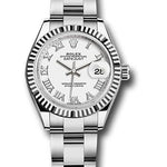 28mm white Rolesor case comprised of a 904L steel monobloc middle case, screw-down steel back, screw-down crown with twinlock double waterproofness system, 18K white gold fluted bezel, scratch-resistant sapphire crystal with cyclops lens over the date and double anti-reflective coating, white dial, Roman numerals, Rolex calibre 2236 automatic movement with center hour, minute and seconds hands, instantaneous date with rapid setting, and stop-seconds for precise time setting, stainless steel Oyster bracelet with flat three-piece links, folding Oysterclasp buckle with Easylink 5mm comfort extension link. Waterproof to 100 meters.