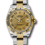 31mm stainless steel case, 18K yellow gold fluted bezel, champagne concentric circle dial, Arabic numerals, and stainless steel and 18K yellow gold Oyster bracelet.