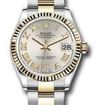 31mm yellow Rolesor case comprised of Oystersteel and 18K yellow gold, screw-down back, screw-down crown with twinlock double waterproofness system, 18K yellow gold fluted bezel, scratch-resistant sapphire crystal with cyclops lens over the date, silver dial, Roman numerals with 11 diamonds set on VI, Rolex calibre 2236 perpetual self-winding movement with date at 3 o'clock, approximately 55 hours of power reserve, yellow Rolesor Oyster bracelet made from a combination of 904L steel and 18K yellow gold with flat three-piece links, folding Oysterclasp buckle with Easylink 5mm comfort extension link. Waterproof to 100 meters. Baselworld 2019 release.