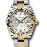 31mm stainless steel case, 18K yellow gold fluted bezel, silver jubilee dial, diamond hour markers, and stainless steel and 18K yellow gold Oyster bracelet.