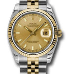 36mm stainless steel case, 18K yellow gold fluted bezel, champagne dial, stick hour markers, and stainless steel and 18K yellow gold Jubilee bracelet.