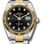 41mm Yellow Rolesor case with 904L steel monobloc middle case, screw-down steel back, 18K yellow gold screw-down crown, 18K yellow gold fluted bezel, scratch-resistant double anti-reflective sapphire crystal with cyclops lens over the date, black dial, diamond hour markers, Rolex calibre 3235 perpetual self-winding movement with date at 3 o'clock that changes instantaneously at midnight in a few thousandths of a second, approximately 70 hours of power reserve, yellow Rolesor Oyster bracelet made from a combination of 904L steel and 18K yellow gold with flat three-piece links, folding Oysterclasp buckle with Easylink 5mm comfort extension link. Waterproof to 100 meters.