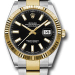 41mm Yellow Rolesor case with 904L steel monobloc middle case, screw-down steel back, 18K yellow gold screw-down crown, 18K yellow gold fluted bezel, scratch-resistant double anti-reflective sapphire crystal with cyclops lens over the date, black dial, index hour markers, Rolex calibre 3235 perpetual self-winding movement with date at 3 o'clock that changes instantaneously at midnight in a few thousandths of a second, approximately 70 hours of power reserve, yellow Rolesor Oyster bracelet made from a combination of 904L steel and 18K yellow gold with flat three-piece links, folding Oysterclasp buckle with Easylink 5mm comfort extension link. Waterproof to 100 meters.