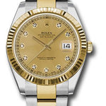 41mm Yellow Rolesor case with 904L steel monobloc middle case, screw-down steel back, 18K yellow gold screw-down crown, 18K yellow gold fluted bezel, scratch-resistant double anti-reflective sapphire crystal with cyclops lens over the date, champagne dial, diamond hour markers, Rolex calibre 3235 perpetual self-winding movement with date at 3 o'clock that changes instantaneously at midnight in a few thousandths of a second, approximately 70 hours of power reserve, yellow Rolesor Oyster bracelet made from a combination of 904L steel and 18K yellow gold with flat three-piece links, folding Oysterclasp buckle with Easylink 5mm comfort extension link. Waterproof to 100 meters.