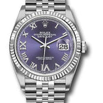 36mm Oystersteel case, screw-down steel back, screw-down crown with twinlock double waterproofness system, fluted bezel, scratch-resistant sapphire crystal with cyclops lens over the date, aubergine dial, Roman numerals with diamond set 6 and 9, Rolex calibre 3235 perpetual self-winding movement with center hour, minute and seconds hands, instantaneous date at 3 o'clock with rapid setting, and stop-seconds for precise time setting, approximately 70 hours of power reserve, Jubilee bracelet with five-piece links, folding Oysterclasp buckle with Easylink 5mm comfort extension link. Waterproof to 100 meters. Baselworld 2019 release.