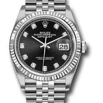 36mm Oystersteel case, screw-down steel back, screw-down crown with twinlock double waterproofness system, fluted bezel, scratch-resistant sapphire crystal with cyclops lens over the date, black dial, diamond hour markers, Rolex calibre 3235 perpetual self-winding movement with center hour, minute and seconds hands, instantaneous date at 3 o'clock with rapid setting, and stop-seconds for precise time setting, approximately 70 hours of power reserve, Jubilee bracelet with five-piece links, folding Oysterclasp buckle with Easylink 5mm comfort extension link. Waterproof to 100 meters. Baselworld 2019 release.