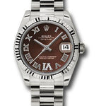 31mm 18K white gold case, screw-down crown with twinlock double waterproofness system, fluted bezel, scratch-resistant sapphire crystal with cyclops lens over the date, bronze diamond Roman VI dial, Roman numerals with 11 diamonds set on VI, Rolex calibre 2235 automatic movement, President bracelet with semi-circular three-piece links, concealed folding Crownclasp buckle. Waterproof to 100 meters.
