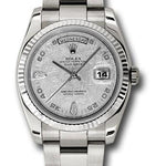 36mm 18K white gold case, fluted bezel, meteorite dial, 2 diamond hour markers and Arabic numerals, and Oyster bracelet.