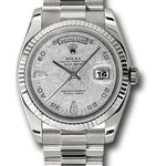 36mm 18K white gold case, fluted bezel, meteorite dial, 2 diamond hour markers and Arabic numerals, and President bracelet.