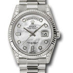 36mm 18K white gold case, case lugs set with 32 diamonds, fluted bezel, mother of pearl dial, diamond hour markers, and President bracelet.