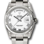 36mm 18K white gold case, case lugs set with 32 diamonds, fluted bezel, white dial, Roman numerals, and Oyster bracelet.