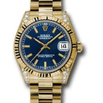 31mm 18K yellow gold case, fluted bezel, case lugs set with 24 diamonds, blue dial, index hour markers, and President bracelet.