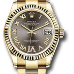 31mm 18K yellow gold case, screw-down crown with twinlock double waterproofness system, fluted bezel, scratch-resistant sapphire crystal with cyclops lens over the date, dark grey diamond Roman IV dial, Roman numerals with 11 diamonds set on VI, Rolex calibre 2236 automatic movement with center hour, minute and seconds hands, instantaneous date with rapid setting, and stop-seconds for precise time setting, approximately 55 hours of power reserve, 18K yellow gold Oyster bracelet with flat three-piece links, concealed folding Crownclasp buckle. Waterproof to 100 meters.