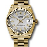 31mm 18K yellow gold case, screw-down crown with twinlock double waterproofness system, fluted bezel, scratch-resistant sapphire crystal with cyclops lens over the date, silver diamond Roman VI dial, index hour markers, Rolex calibre 2235 automatic movement, President bracelet with semi-circular three-piece links, concealed folding Crownclasp buckle. Waterproof to 100 meters.