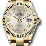 31mm 18K yellow gold case, screw-down crown with twinlock double waterproofness system, fluted bezel, scratch-resistant sapphire crystal with cyclops lens over the date, silver diamond Roman IV dial, Roman numerals with 11 diamonds set on VI, Rolex calibre 2236 automatic movement with center hour, minute and seconds hands, instantaneous date with rapid setting, and stop-seconds for precise time setting, approximately 55 hours of power reserve, 18K yellow gold Oyster bracelet with flat three-piece links, concealed folding Crownclasp buckle. Waterproof to 100 meters.
