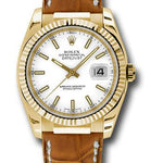 Rolex Yellow Gold Datejust 36 Watch - Fluted Bezel - White Index Dial - Brown Leather - 116138 wsb