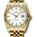 36mm 18K yellow gold case, fluted bezel, white dial, stick hour markers, and 18K yellow gold Jubilee bracelet.