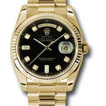36mm 18K yellow gold case, fluted bezel, black dial, 8 round and 2 baguette diamond hour markers, and President bracelet.